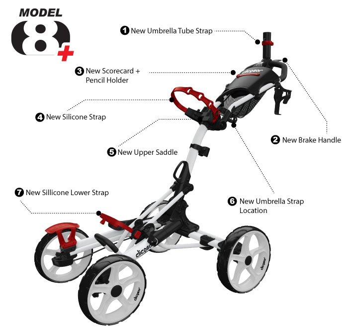 | The new Model 8+ has a much improved and easier to use brake handle. The new design brake borrows from the proven design of the Clicgear M3.5+ and M4. We’re happy to finally have this improvement done as it was one of the most requested changes. |